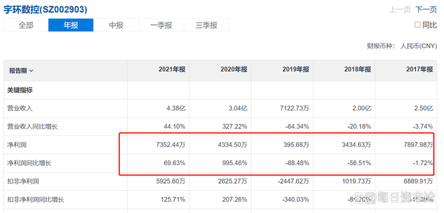 业绩连续三年下滑之后,宇环数控在2020年终于迎来了大逆转——当年净利润达到了4334万元,2021年继续上升至7352万元。