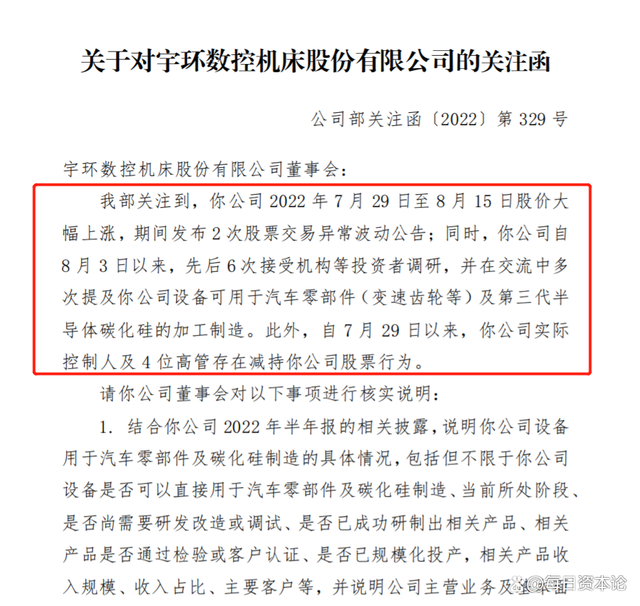 宇环数控由连续涨停到连续大跌的主要原因或来自被疑炒作。8月15日,深交所向宇环数控下发关注函,要求宇环数控结合公司2022年半年报的相关披露,说明公司主营业务及基本面是否发生重大变化;说明公司在投资者调研中突出强调公司设备运用在汽车零部件及碳化硅制造的目的,是否存在迎合市场热点炒作公司股价的情形,并详细说明近期接待投资者调研是否存在违反公平披露原则的事项及其具体情况。