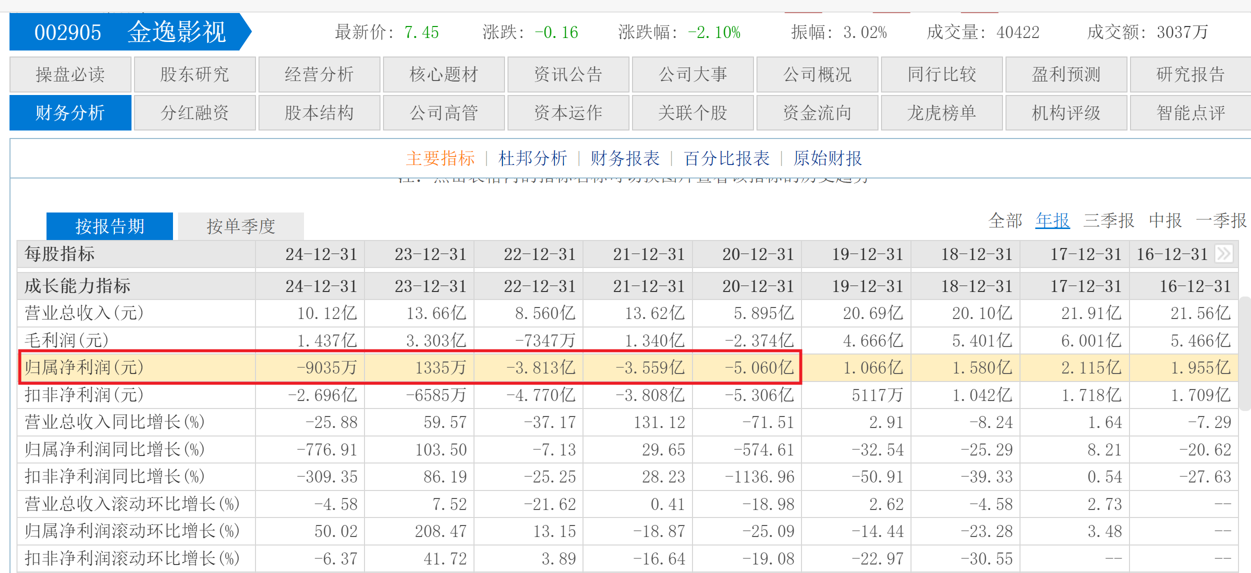 金逸影视曾经怀揣着电影梦想,在资本市场崭露头角,如今再次陷入亏损。金逸影视发布的2024年财务报表显示,报告期内,该公司的营收减少25.88%至10.12亿元,归母净利润-9035.42万元,继2023年艰难扭亏后再陷亏损。