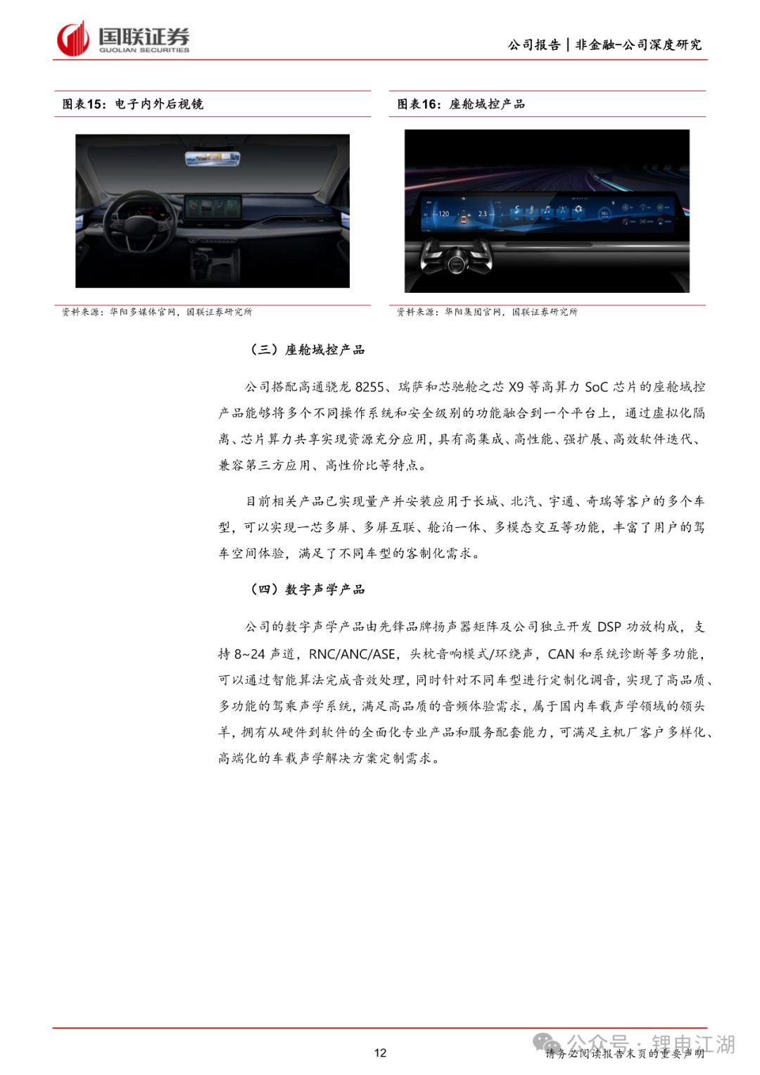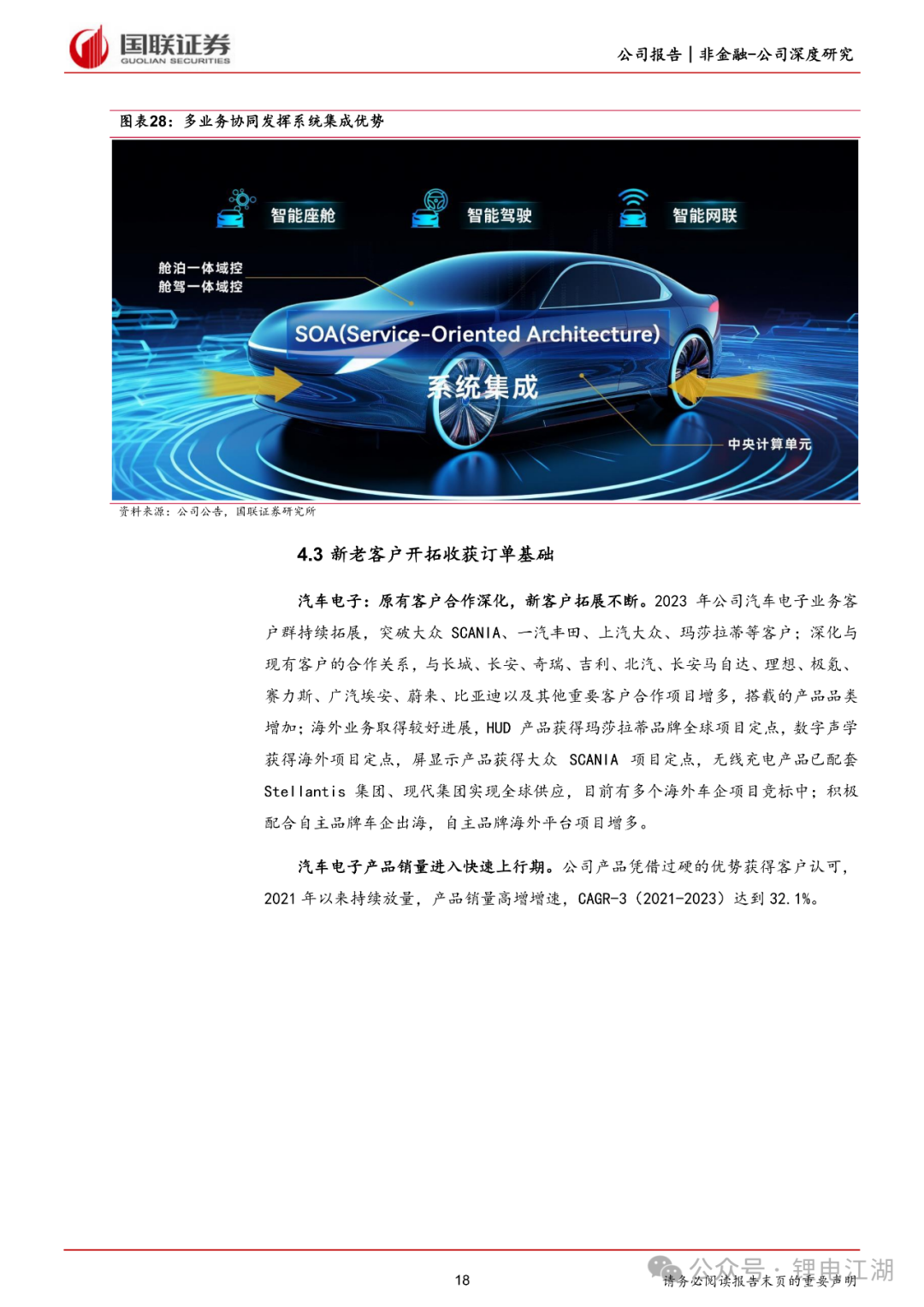 公司汽车电子业务客户群持续拓展,突破大众SCANIA、一汽丰田、上汽大众、玛莎拉蒂等客户;深化与现有客户的合作关系,与长城、长安、奇瑞、吉利、北汽、长安马自达、理想、极氪、赛力斯、广汽埃安、蔚来、比亚迪以及其他重要客户合作项目增多,搭载的产品品类增加,订单迎来收获期。