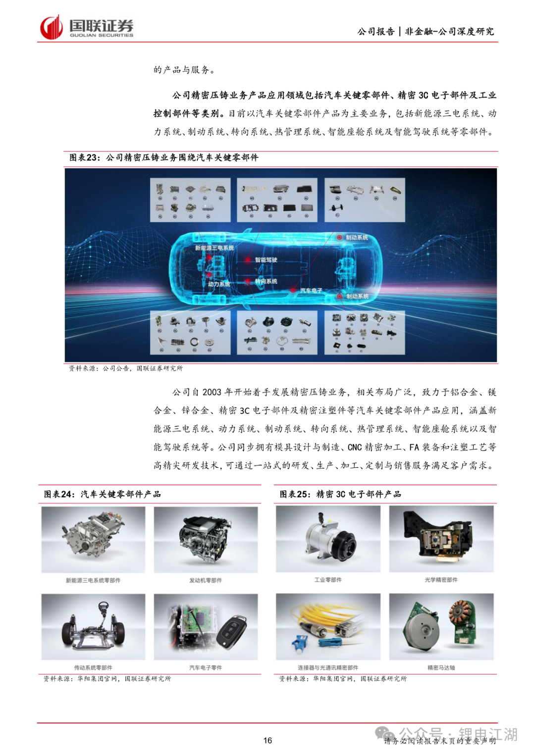 公司精准把握汽车产业轻量化趋势,围绕汽车关键零部件、精密3C电子部件及工业控制部件等开展精密压铸业务,目前以汽车关键零部件产品为主要业务,包括新能源三电系统、动力系统、制动系统、转向系统、热管理系统、智能座舱系统及智能驾驶系统等零部件。随着扩产产能的进一步释放,精密压铸业务有望为公司打造新增长极。
