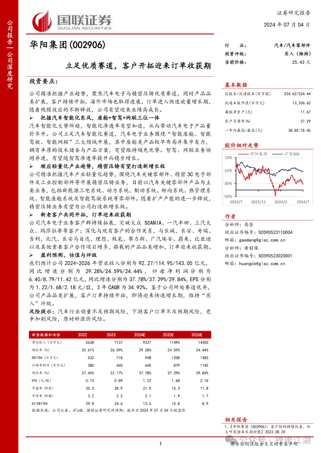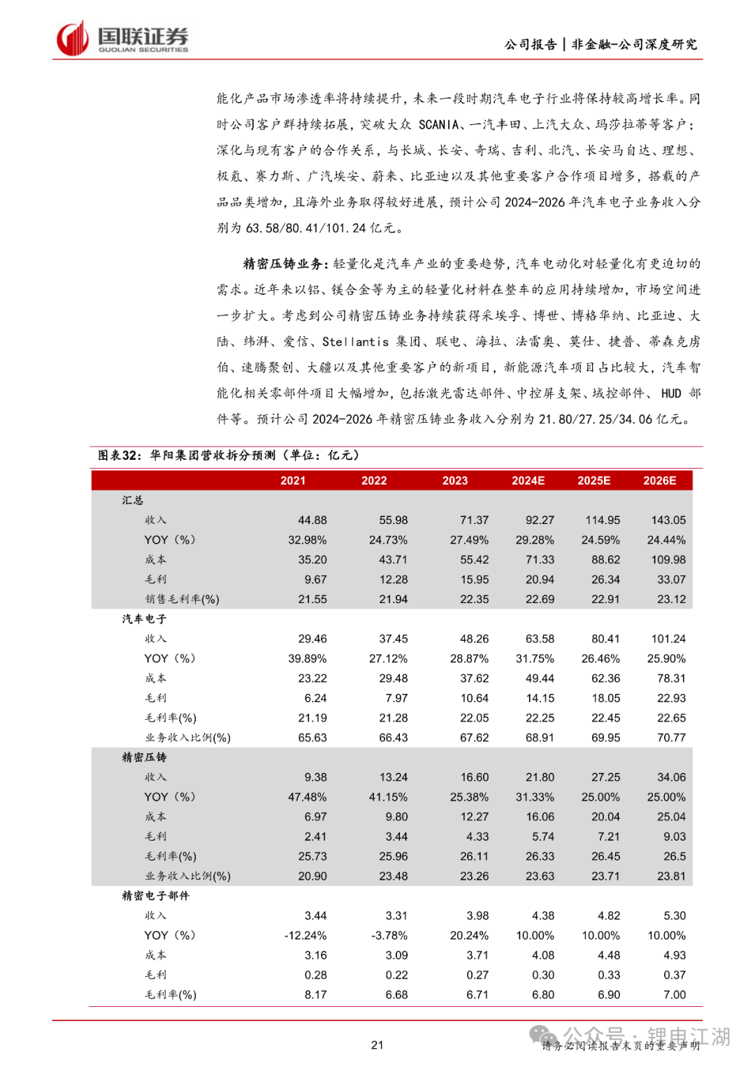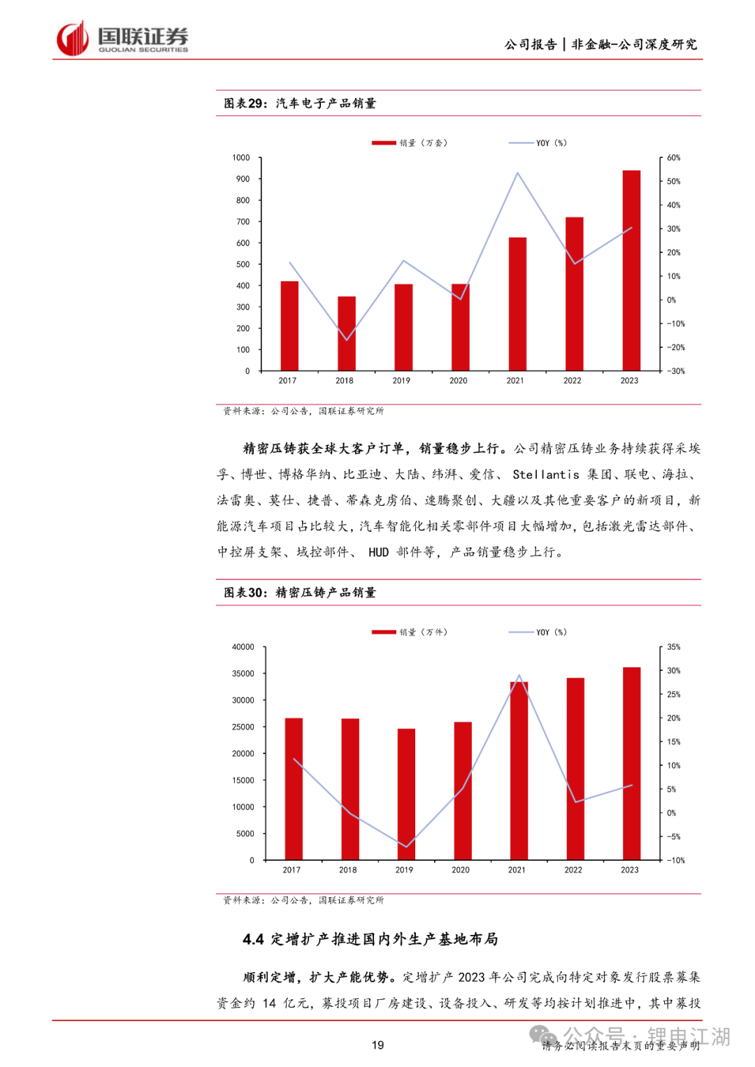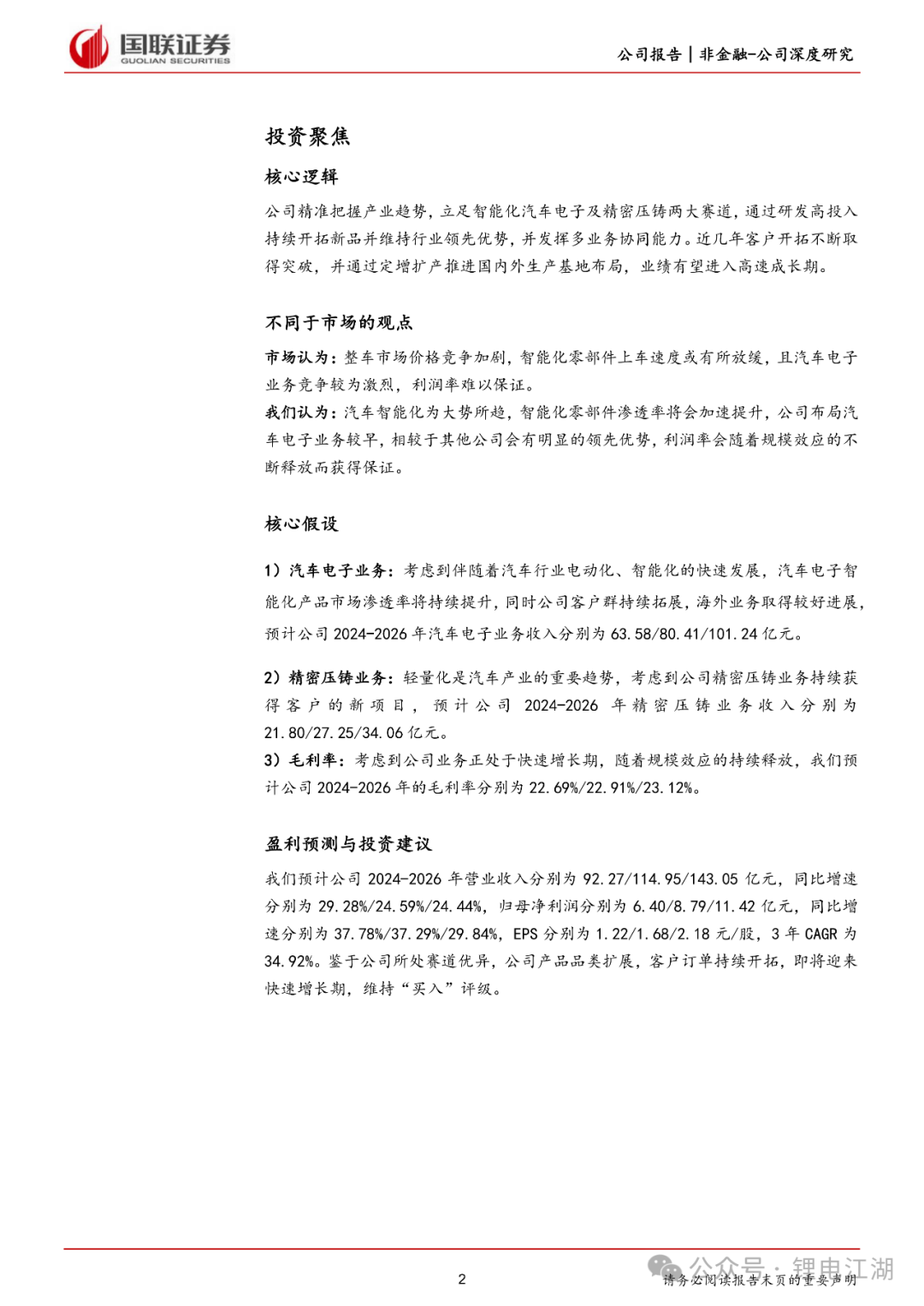 公司精准把握产业趋势,聚焦汽车电子与精密压铸优质赛道,同时产品品类扩展,客户持续开拓,海外市场也取得进展,订单进入快速放量增长期,随着规模效应的不断释放,公司有望迎来业绩高成长。
