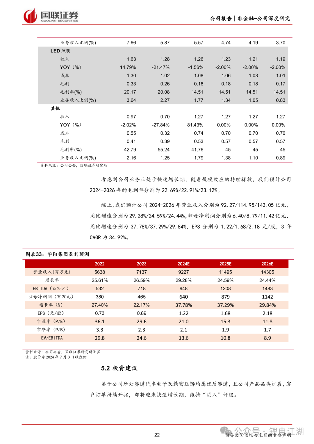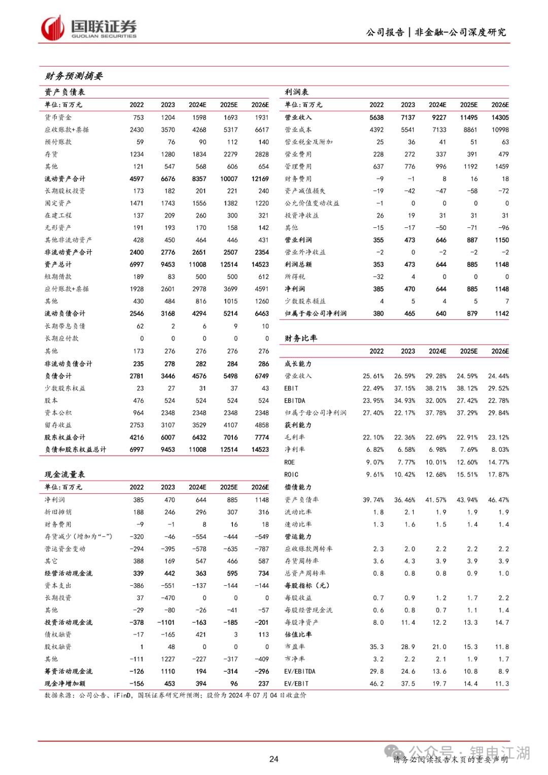 我们预计公司2024-2026年营业收入分别为92.27/114.95/143.05亿元,同比增速分别为29.28%/24.59%/24.44%,归母净利润分别为6.40/8.79/11.42亿元,同比增速分别为37.78%/37.29%/29.84%,EPS分别为1.22/1.68/2.18元/股,3年CAGR为34.92%。鉴于公司所处赛道优异,公司产品品类扩展,客户订单持续开拓,即将迎来快速增长期,维持“买入”评级。