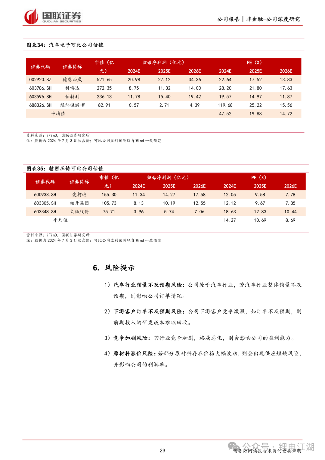 风险提示:汽车行业销量不及预期风险,下游客户订单不及预期风险,竞争加剧风险,原材料涨价风险。