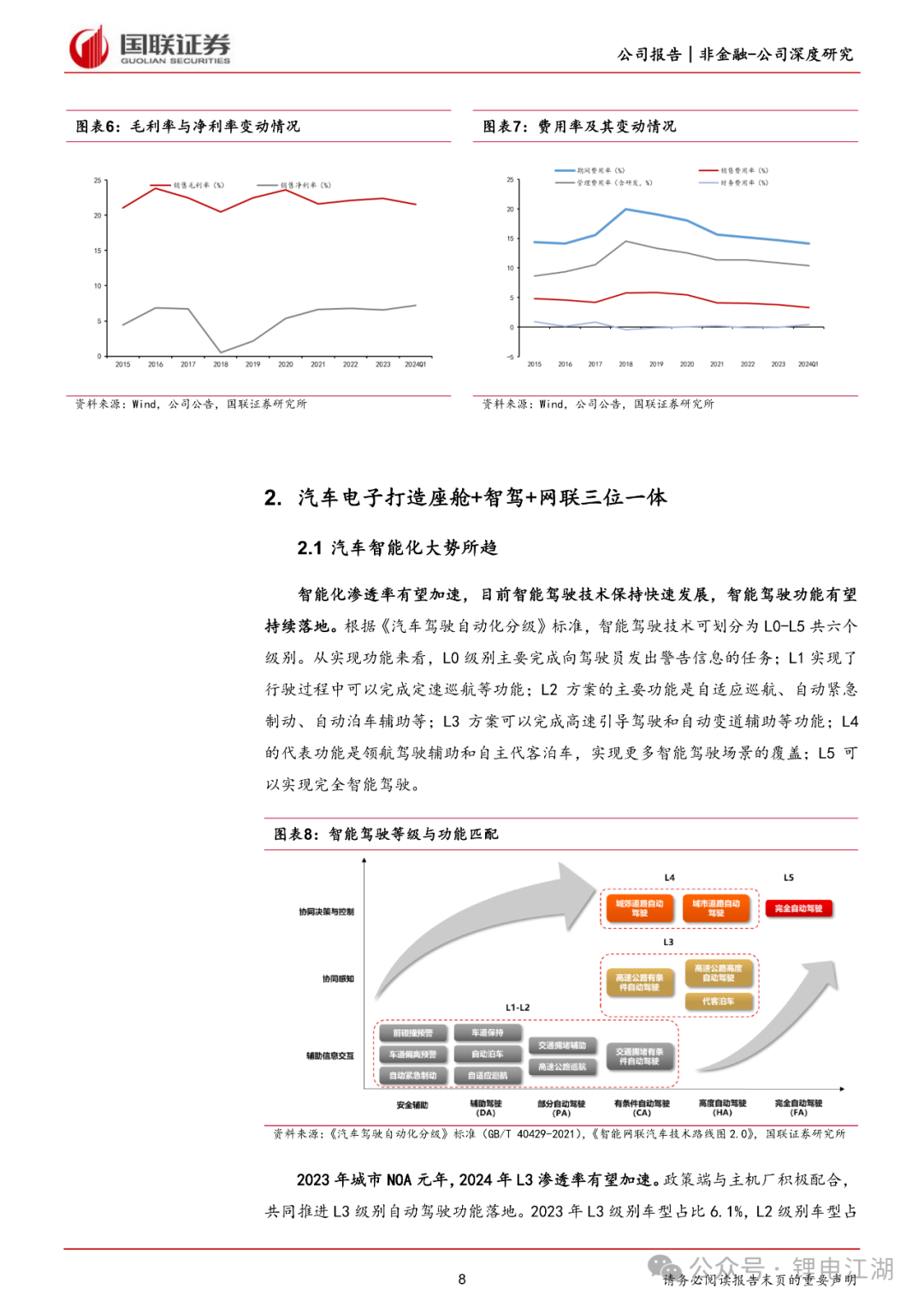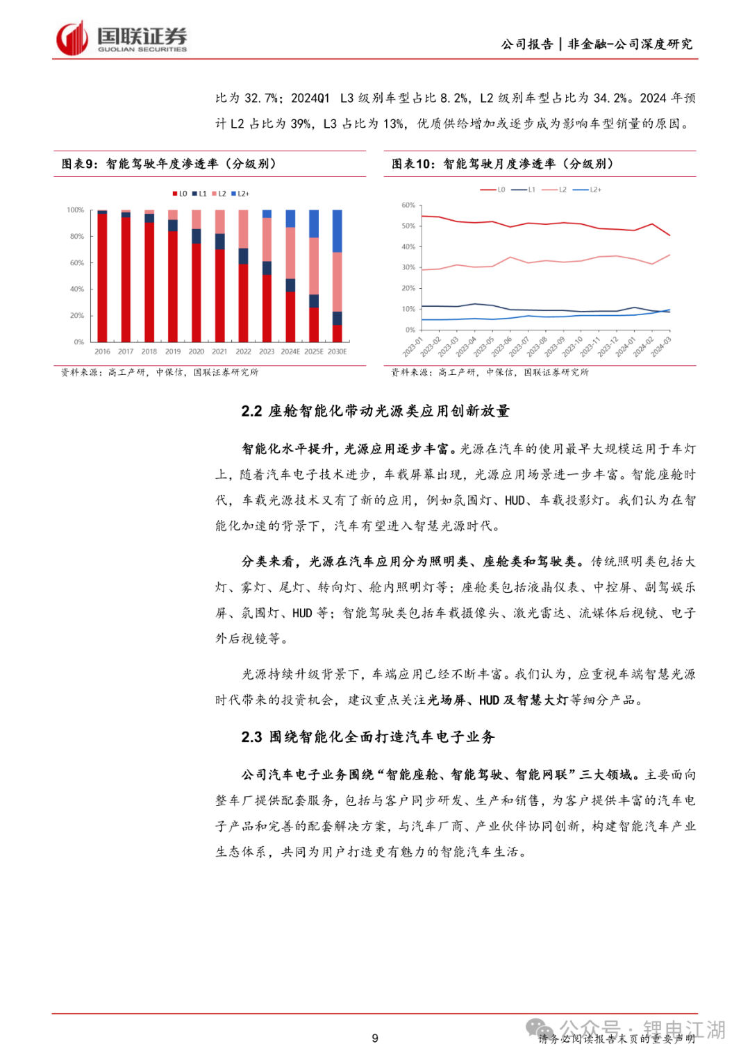汽车智能化大势所趋,智能化渗透率有望加速,从而带动汽车电子产品量价齐升。公司立足汽车智能化赛道,汽车电子业务围绕“智能座舱、智能驾驶、智能网联”三大领域开展,其中座舱类产品较早布局并集中发力,拥有丰厚的技术储备与产品方案,有望维持领先优势。智驾、网联业务协同并进,有望随智驾渗透率提升而稳步增长。