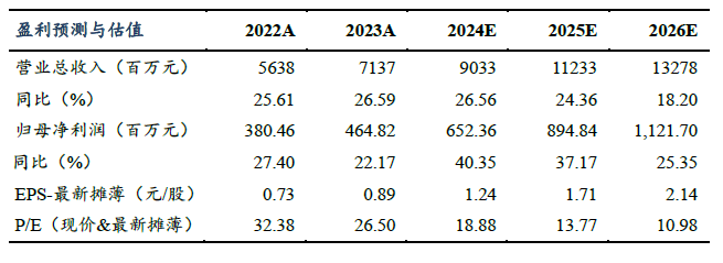 我们维持公司2024-2026年营收预测为90.3/112.3/132.8亿元,同比分别+27%/+24%/+18%;维持2024-2026年归母净利润预测为6.5/8.9/11.2亿元,同比分别+40%/+37%/+25%,对应PE分别为19/14/11倍,维持“买入”评级。