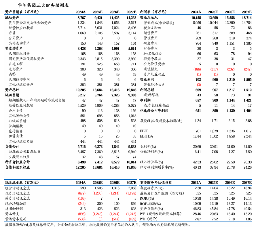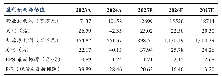由于公司订单释放节奏超预期,我们上调公司2025-2026年营收预测为127.0/155.6元(原为121.7/143.9亿元),预计2027年营业收入为187.1亿元,同比分别+25%/+23%/+20%;基本维持2025-2026年归母净利润预测为9.0/11.3亿元,预计2027年归母净利润为14.0亿元,同比分别+38%/+26%/+24%,对应PE分别为21/16/13倍,维持“买入”评级。