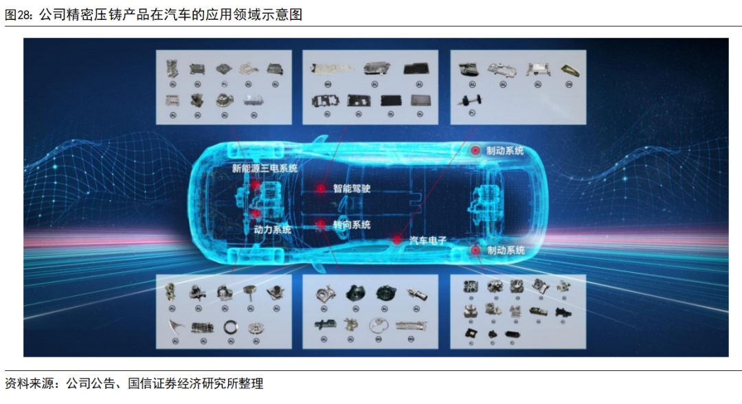 产品维度,公司精密压铸业务主要为铝合金、镁合金、锌合金精密压铸件、精密加工件的研发、生产、销售。公司以精密模具设计、制造技术为核心,以强大的工艺技术、精密加工及表面处理能力为基础,持续打造一站式服务模式,致力于为客户提供有竞争力且安心的产品与服务。公司精密压铸业务产品应用领域包括汽车关键零部件、精密 3C 电子部件及工业控制部件等类别,其中以汽车关键零部件为主要应用领域。精密压铸业务产品主要包括新能源三电系统、动力系统、制动系统、转向系统、车身控制系统、智能座舱系统及智能驾驶系统、汽车高速高频连接器、光通讯模块等零部件。