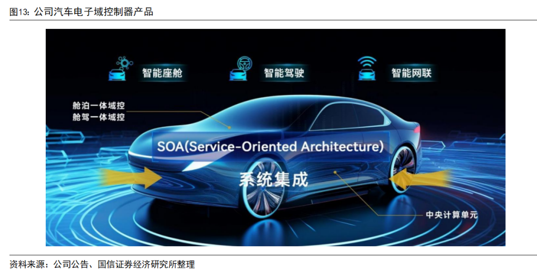 此外,公司顺应汽车 E/E 架构分布式控制向区域控制、中央集中控制升级的产业趋势,以 SOA 架构为桥梁,通过敏捷开发、配置化管理等实现区域、跨域融合产品的快速落地,目前公司已推出舱泊一体域控、舱驾一体域控产品,正在研发中央计算单元等跨域融合产品,持续提升汽车电子系统集成优势。