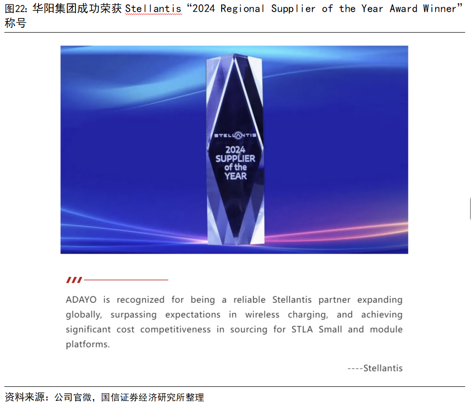 2024年,公司产品质量交付方面取得客户高度认可,获得较多奖项。公司获得“2024 中国汽车供应链百强”“2024 广东企业 500 强”“2024 年广东省电子信息制造业综合实力百强企业”、Stellantis 集团“2024 Regional Supplier of the Year Award Winner”奖,华阳通用、华阳多媒体同时获得中国汽车工业质量大会“2024 年度质量表现最佳”称号,华阳通用获得长安汽车“协同贡献奖”、吉利银河“最佳项目协同奖”、上汽集团“卓越贡献奖”、长安福特“卓越供应商”奖,华阳多媒体获得“2024 年广东省电子信息制造业高成长创新企业”、长城汽车“2024 年度最佳合作伙伴”及“质量追风奖”。2024年9月24日,Stellantis第四届年度供应商大会在意大利都灵Lingotto会议中心举行,在本次供应商奖项评选中,Stellantis 共设立了21个奖项,以表彰在不同领域表现卓越的合作伙伴,华阳集团成功荣获“2024 Regional Supplier of the Year Award Winner”称号。