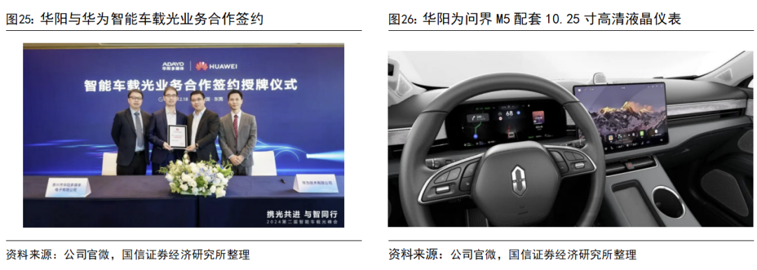 2024年12月18日,“第二届智能车载光峰会”在广东省成功举办,华阳与华为智能车载光业务合作签约。在本次峰会期间举行的华为智能车载光业务合作签约授牌仪式上,华阳多媒体作为华为智能车载光AR-HUD领域的首批合作伙伴,成功完成签约并授牌。双方于2022年联合研发的LCOS AR-HUD产品,不仅在小体积内实现了高分辨率与大FOV视场显示的效果,还突破性地解决了阳光倒灌的行业痛点。目前,该产品已在LOTUS EMEYA车型上实现量产。作为金康赛力斯的汽车电子产品配套供应商之一,华阳自AITO品牌推出首款车型问界M5以来,便为其提供HUD、“10.25英寸高清液晶仪表”、“大功率无线充电”及“NFC钥匙模块”等产品配套;凭借优秀的产品品质和服务保障,华阳与赛力斯的合作再升级,为其进阶车型问界M7提供产品配套。