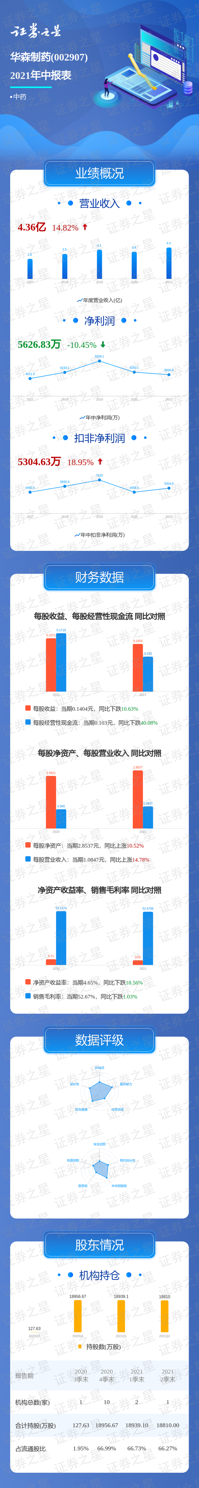 证券之星数据中心讯,华森制药2021中报显示,公司主营收入4.36亿元,同比上升14.82%;归母净利润5626.83万元,同比下降10.45%;扣非净利润5304.63万元,同比上升18.95%;负债率32.24%,投资收益-154.0万元,财务费用318.98万元,毛利率52.67%。