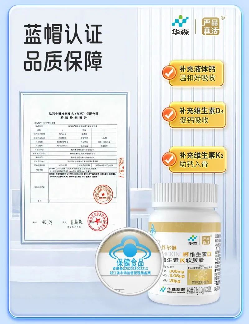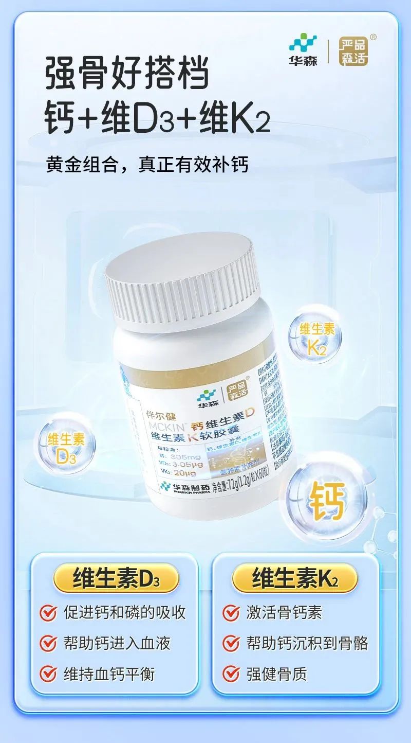 华森制药伴尔健钙维生素D维生素K软胶囊,每粒含高达305mg的液体钙,比一般钙片更易吸收;维生素D,促钙吸收,提高血钙水平;维生素K,领钙入骨,引导血液中的钙在骨骼中沉积,以加强骨骼结构。无论是4岁的小朋友,还是身怀六甲的孕妇、正在哺乳的乳母,都可以放心选择伴尔健钙DK。