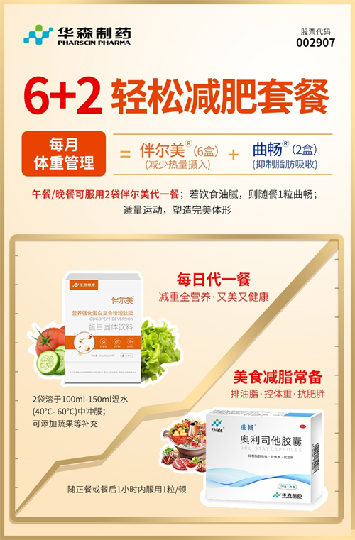 不论是对于变美还是健康,健康减重非常重要,这需要严格遵循“科学饮食+营养均衡+合理运动”的核心理念。随着生活节奏的加快,容易饮食不规律,过劳肥比较常见。再加上一轮又一轮年底聚餐来袭…吃吃喝喝不停歇,体重飙升的节奏压都压不住。面对这样的情况,我们可以选择华森制药健康减重“黄金搭档”:减少热量摄入的伴尔美?营养强化蛋白复合粉短肽版+抑制脂肪吸收的曲畅?奥利司他胶囊。