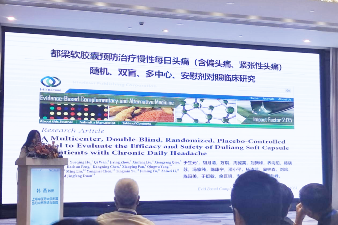 期间,上海中医药大学附属岳阳中西医结合医院韩燕教授分享了《中医药治疗头痛的循证进展》,她多维度分析了头痛的现代医学、中医学诊疗进展等相关内容,重点讲解了都梁软胶囊多中心研究《都梁软胶囊预防治疗慢性每日头痛多中心、随机、双盲、安慰剂对照试验》结果,展示了都梁软胶囊预防治疗慢性每日头痛的确切疗效以及安全性,为广大临床医生提供了头痛疾病的另一种可供选择的治疗策略。