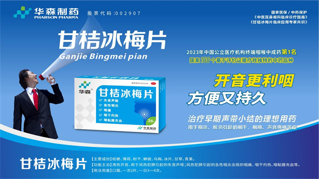 呼吸道疾病保护咽喉健康是关键,华森制药甘桔冰梅片源自经典喉科名方,由桔梗、薄荷、射干、青果、冰片、蝉蜕、乌梅、甘草共八味药物组方而成,具有清热开音的功效,用于风热犯肺引起的失音声哑及急性咽炎出现的咽痛、咽干灼热、咽粘膜充血等。2021年由中华中医药学会发布的《甘桔冰梅片临床应用专家共识》指出,甘桔冰梅片具有明显的抗炎、抑菌、抗病毒作用,可有效治疗急性咽炎、急性喉炎、急性扁桃体炎、慢性咽炎、慢性喉炎等,快速缓解咽痛、咽干灼热、咽痒咳嗽、声音嘶哑等症状,并明确了甘桔冰梅片治疗儿童嗓音咽喉疾病的用法用量。