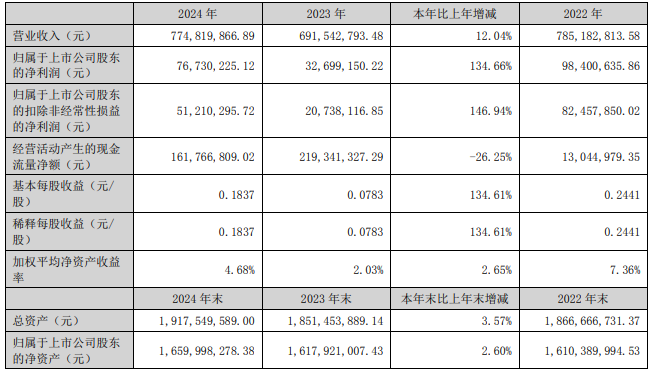 2024年,公司实现营业收入7.75亿元,同比增长12.04%;归属于上市公司股东的净利润7673.02万元,同比增长134.66%;归属于上市公司股东的扣非净利润5121.03万元,同比增长146.94%;经营活动产生的现金流量净额为1.62亿元,同比下滑26.25%。