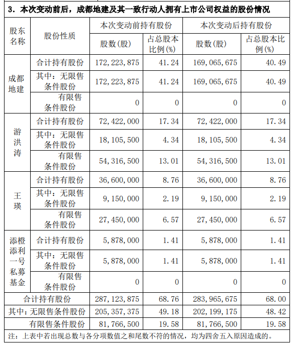 成都地建因自身资金需求,于2025年6月10日至2025年6月25日通过集中竞价方式减持948,400股,占公司总股本的0.23%;通过大宗交易方式减持2,209,800股,占公司总股本的0.53%。本次权益变动后,成都地建及其一致行动人合计持有公司股份283,965,675股,占公司总股本的68.00%。