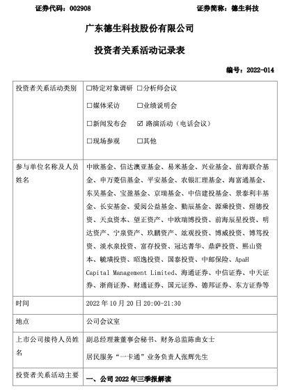 10月22日,广东德生科技股份有限公司(以下简称“德生科技”或“公司”)发布公告。公告称,公司10月20日与中欧基金、信达澳亚基金、易米基金、兴业基金、前海联合基金等多家机构投资者进行了路演活动(电话会议)。会议中,公司解读了2022年三季报:2022年前三季度,公司实现营业收入同比增长50.18%,归属于上市公司股东的净利润同比增长65.84%。其中,第三季度单季度营业收入同比增长78.97%,归属于上市公司股东的净利润同比增长97.71%。