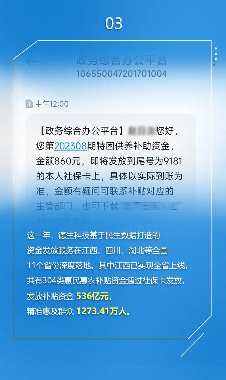 2023年,德生科技积极拓展以社会保障卡为载体的居民服务一卡通应用场景,以应用赋能、服务赋能、数据赋能,为多地政府公共服务和群众办事生活服务提质增效,让广大群众共享数字化发展成果。