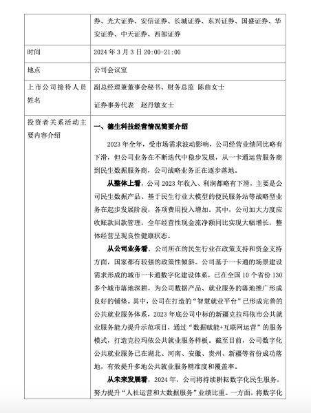 德生科技向投资者介绍了公司经营情况。2023年全年,受市场需求波动影响,公司经营业绩同比略有下滑,但公司业务在不断迭代中稳步发展,从一卡通运营服务商到民生数据服务商,公司战略业务正在逐步落地。
