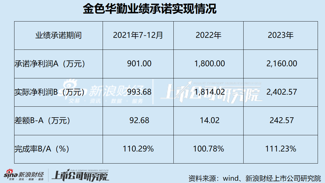 2021年下半年、2022年、2023年,金色华勤承诺净利润分别为901万元、1800万元、2160万元,实际净利润分别为993.68万元、1814.02万元和2402.57万元,涉嫌精准达标,其财务真实性待考。