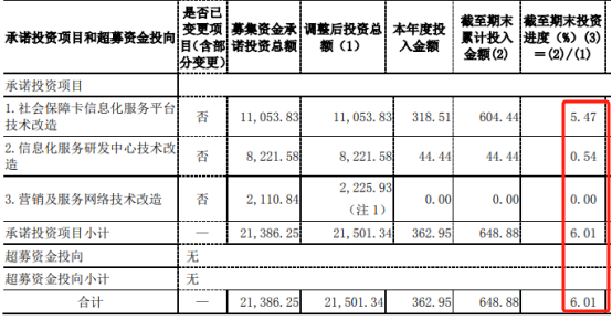 然而,在超过募集资金投资计划半年后,德生科技社会保障卡信息化服务平台技术改造和信息化服务研发中心技术改造两个项目完成度分别只有5.47%和0.54%;营销及服务网络技术改造逾期一年半以后完成进度仍是0。令人诧异的是,在这个统计表中,单个项目进度都不到6%,整体投资进度居然超过6%。