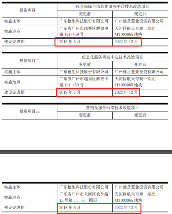 首次延期发生在2020年6月,德生科技宣布将募投项目实施期限延长至2022年12月,这一决定距营销及服务网络技术改造原定建成时间已有两年,距社会保障卡信息化服务平台技术改造和信息化服务研发中心技术改造的原定建成时间也已有一年。