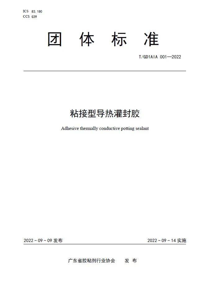 由广州集泰化工股份有限公司牵头编制,广东省胶粘剂行业协会发布的团体标准《粘接型导热灌封胶》已于2022年9月9日发布, 9月14日正式实施。