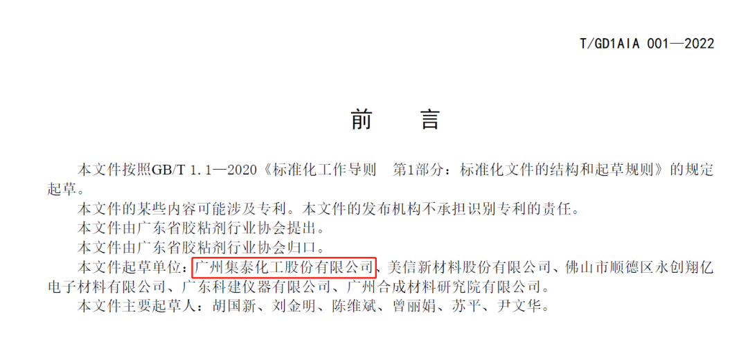 集泰股份作为密封胶行业的龙头企业,牵头并起草编制了《粘接型导热灌封胶》标准,集泰股份有机硅研发组组长胡国新、技术专家委员会科学家刘金明共同参与此项工作。