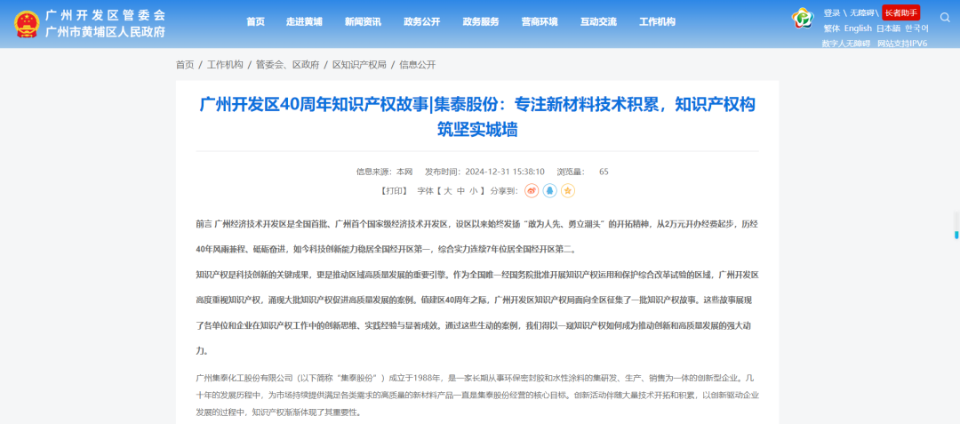 为庆祝广州开发区成立40周年,总结回顾辖区知识产权工作典型案例、经验,广州市黄埔区人民政府网站刊登《广州开发区40周年知识产权故事》系列文章,《集泰股份:专注新材料技术积累,知识产权构筑坚实城墙》入选。