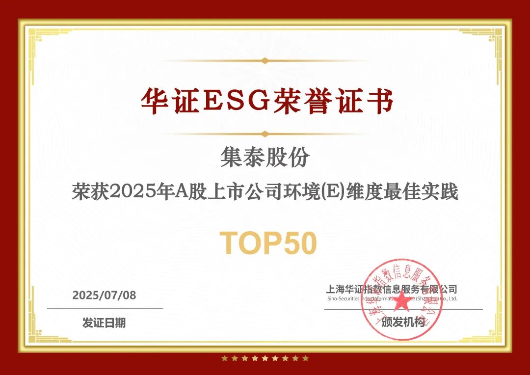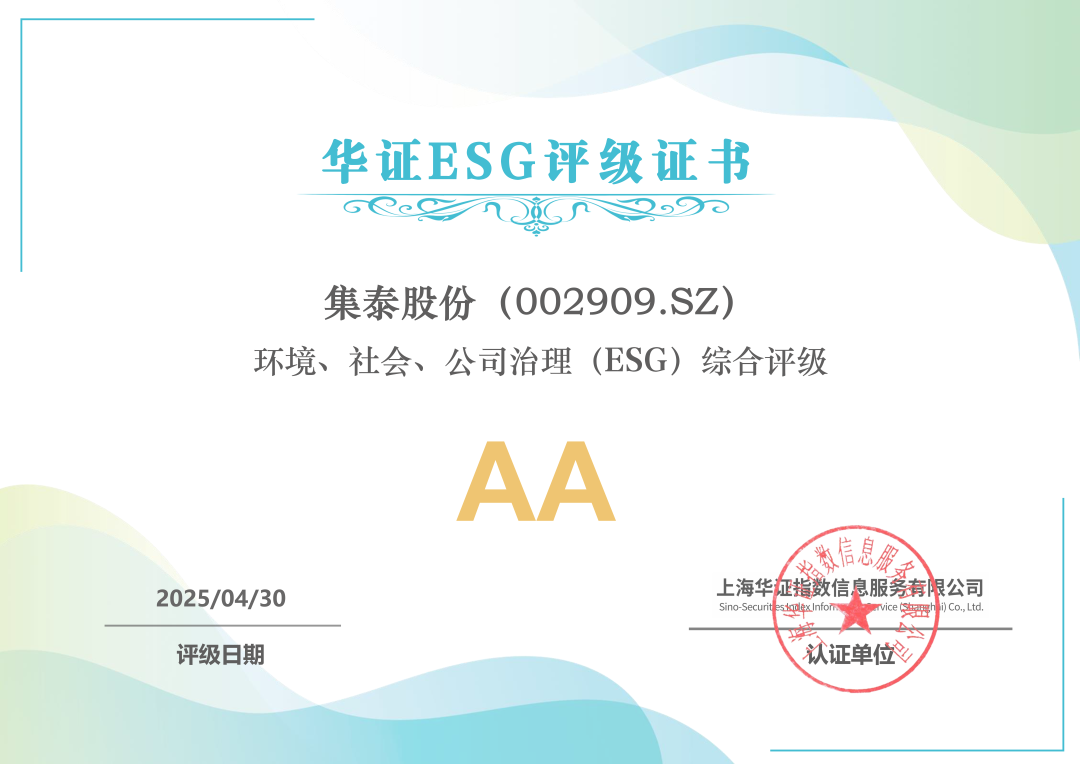集泰股份强势上榜“2025年度A股上市公司环境(E)维度最佳实践TOP50”,并获得“环境、社会、公司治理(ESG)综合评级AA”的肯定。