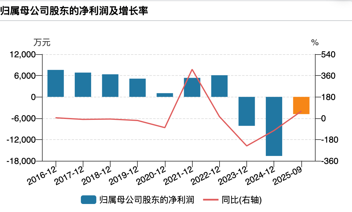 2021年、2022年,国资入主的开始2年,公司营收站上10亿元关口,盈利也正向增长,但2023年开始,庄园牧场经营持续恶化。2023年,公司实现营收9.56亿元,同比下滑8.97%;归母净利润亏损8147.51万元,同比下滑233.70%。2024年,营收进一步下滑至8.90亿元,亏损扩大至1.66亿元,同比下滑104.00%。2025年前三季度,实现营收6.29亿元,同比仍下滑3.10%,虽亏损收窄59.08%,但仍录得净亏损4844.08万元。最近三年,已累计亏损近3亿元。