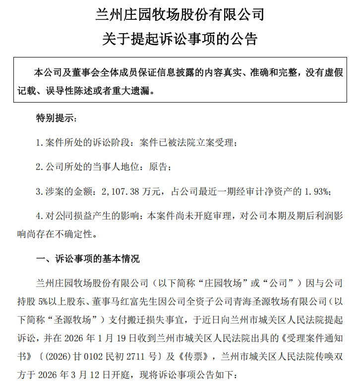 1月20日,庄园牧场公告称,已就全资子公司青海圣源牧场有限公司(以下简称“圣源牧场”)搬迁损失事宜,向兰州市城关区人民法院起诉持股5%以上股东、董事马红富,涉案金额达2107.38万元,其中包括搬迁损失1999.85万元及逾期付款资金占用费107.53万元。目前该案已获法院受理,首次开庭时间定于2026年3月12日。