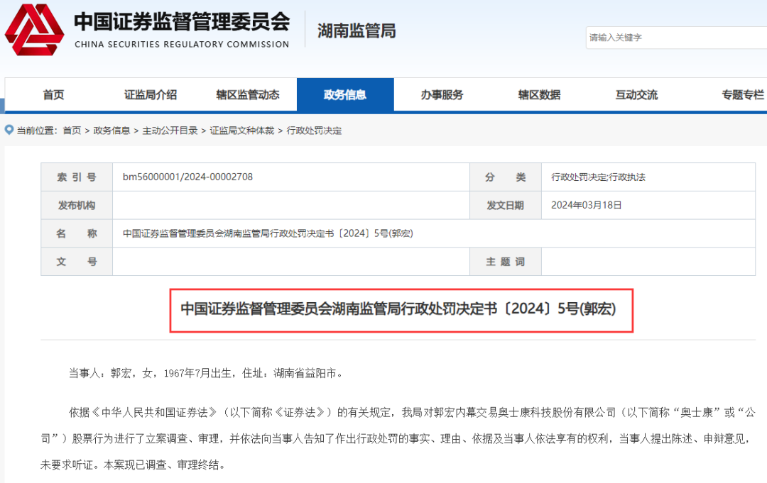 3月18日,湖南证监局网站披露的《行政处罚决定书〔2024〕5号(郭宏)》(下称《行政处罚决定书》)显示,奥士康科技股份有限公司(简称奥士康)时任副总经理、董秘贺梓修的母亲郭宏内幕交易被罚没440万元。