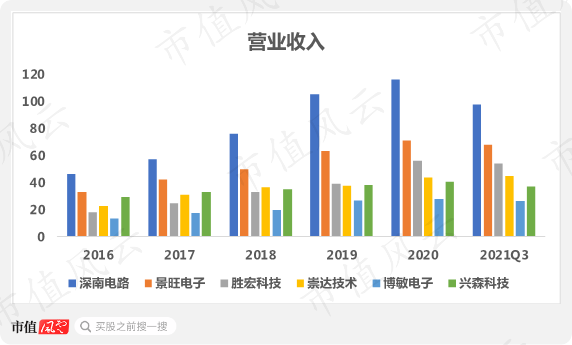 自2016年起连续五年,深南电路营收额居于榜首,2021前三个季度,深南电路创收97.5亿,紧随其后的是景旺电子,营收67.6亿。
