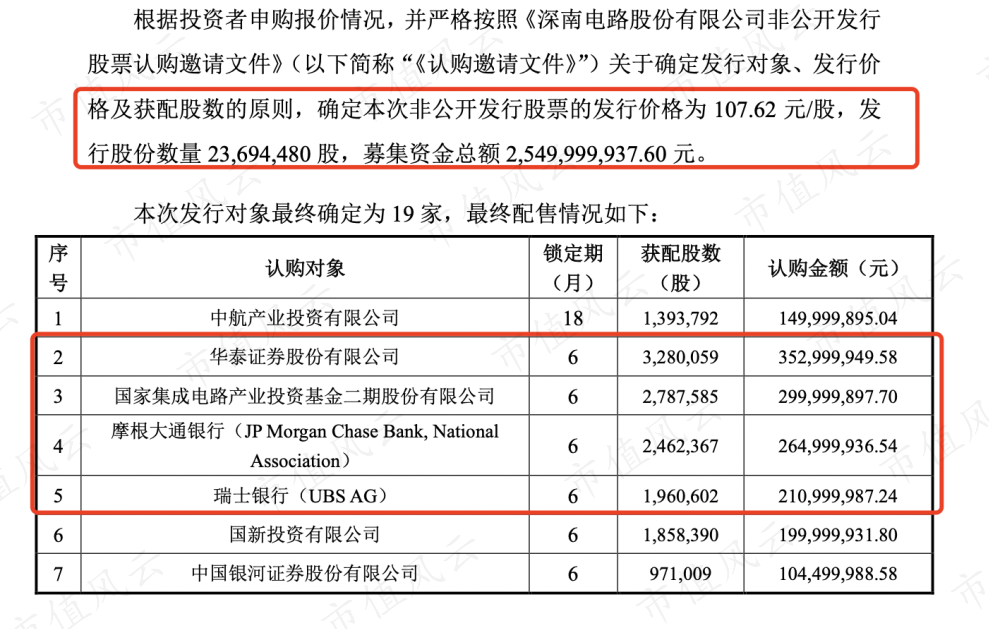从定增的配售结果看,投资团阵容均为大咖,包括:国家队国家集成电路产业投资基金、摩根大通、瑞士银行等。