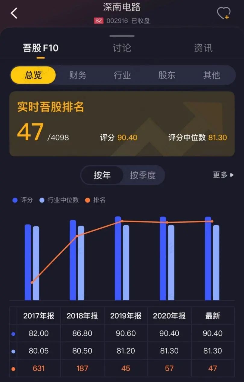 更难得的是,在市值风云APP吾股排名系统中,深南电路取得了47名的优异成绩,基本面表现非常优秀。