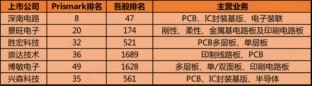 在Prismark全球PCB 50强名单里,景旺电子(603228.SH)、胜宏科技(300476.SZ)、崇达技术(002815.SZ)、博敏电子(603936.SH)以及兴森科技(002436.SZ),在吾股排名表现参差不齐,但都处在中上游。