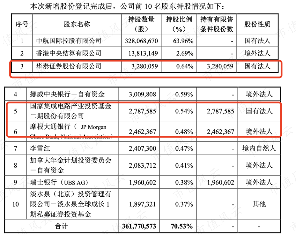 本次新增股份登记完成后,华泰证券、大基金二期、小摩三家均跻身公司前十大股东之列。实控人中航国际持股比例为63.96%,仍为公司第一大股东。