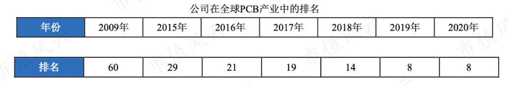 根据Prismark行业报告,公司在全球PCB产业中的排名在逐年提升,2020年位列第8名。