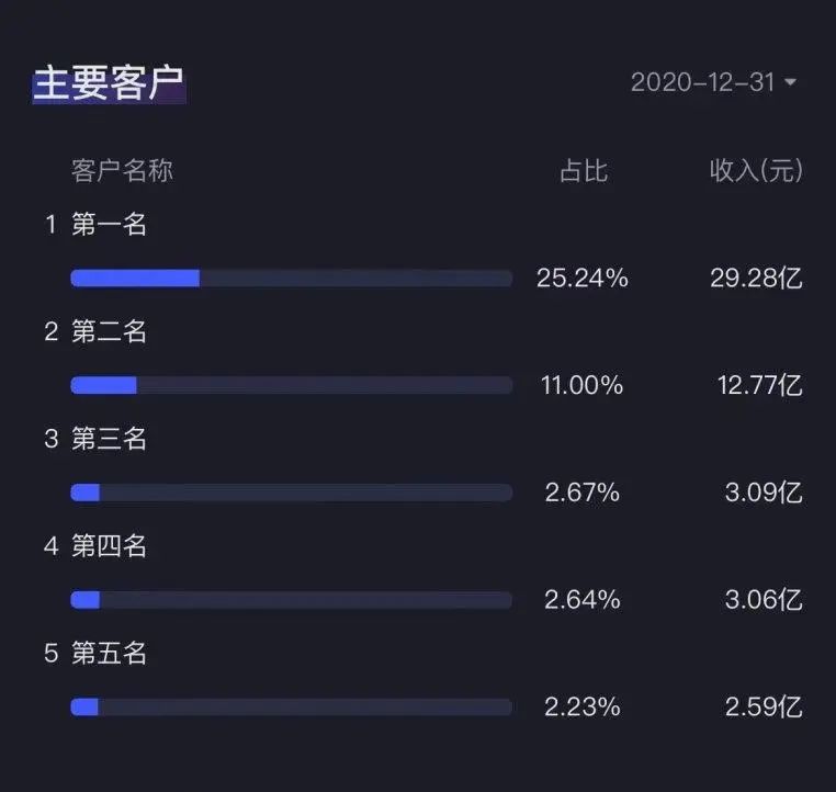 从公司下游客户来看,客户集中度较高,2020年前五大客户合计销售金额占总销售额约43.8%。其中,第一大客户销售额约为29.3亿,占全年总营收的25.3%。