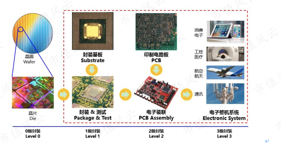 封装基板、印制电路板和电子装联(含电子整机/系统总装)所处产业链环节如下图所示,公司业务覆盖1级到3级封装产业链环节,能够开展方案设计、制造、电子装联、微组装和测试等服务。