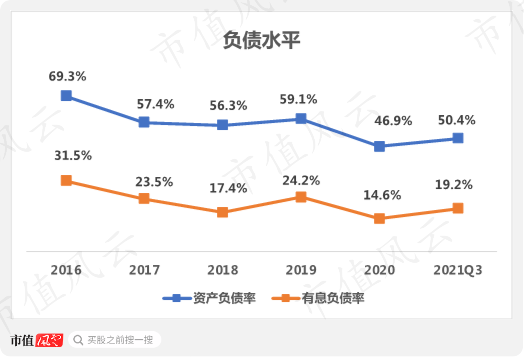 自2016年以来,公司资产负债率情况不断好转,到2020年将近下滑20个百分点,为46.9%。有息负债率走势与资产负债率走势一致,2020年仅为14.6%,负债风险较低。