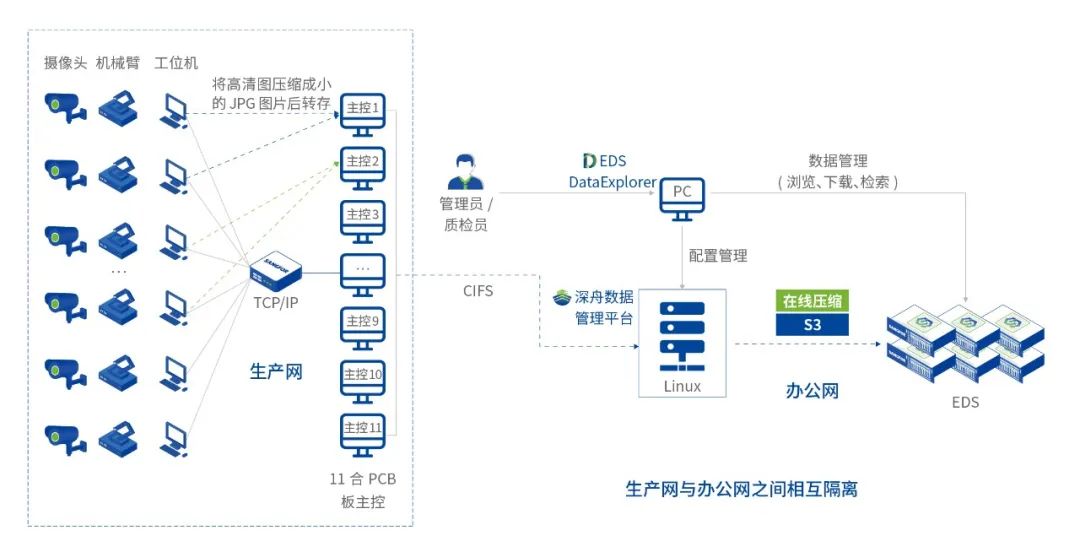 在数据保存上,每个生产环节产生大量的数据,如参数调整、设备状态、产品图片等,都可以得到长期保存和有效管理,并被用于生产效率分析、质量控制。同时,基于分布式存储架构的优势,可以通过增加服务器或硬盘,实现容量和性能的线性同步扩展,满足深南电路长期、稳定保存海量数据的需求。