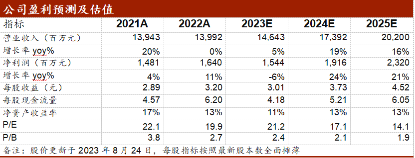 由于PCB及封装基板需求仍有一定压力,我们预计公司2023/2024/2025年归母净利润分别为15.44/19.16/23.2亿元(此前预计2023/2024/2025年归母净利润为18.19/21.49/24.99亿元),按照2023/8/24收盘价,PE为21/17/14倍,维持“买入”评级。