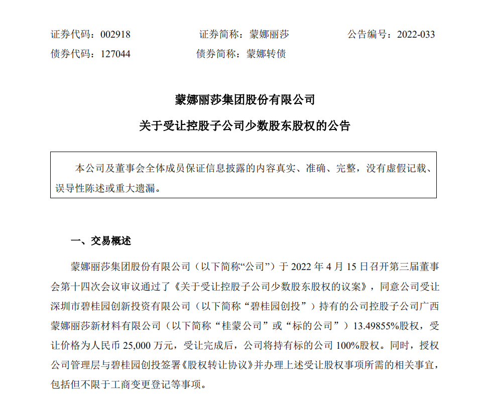 4月16日,蒙娜丽莎发布公告称,公司于2022年4月15日召开第三届董事会第十四次会议审议通过了《关于受让控股子公司少数股东股权的议案》,同意公司受让深圳市碧桂园创新投资有限公司(以下简称“碧桂园创投”)持有的公司控股子公司广西蒙娜丽莎新材料有限公司(以下简称“桂蒙公司”)13.49855%股权,受让价格为人民币25,000万元,受让完成后,公司将持有标的公司100%股权。