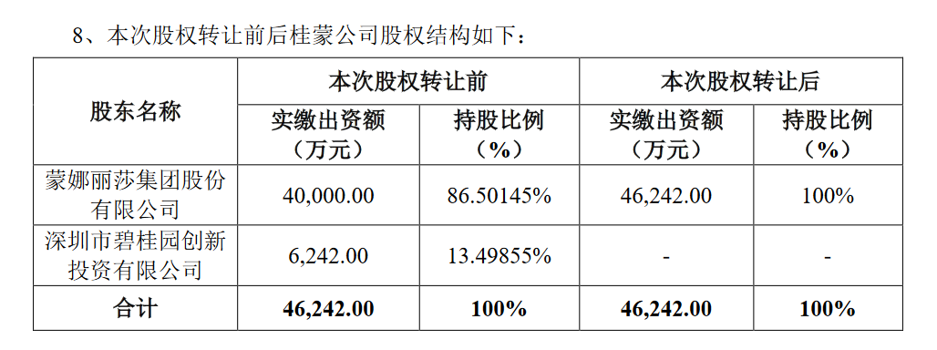“桂蒙公司”引入“碧桂园创投”起源于2020年12月,据蒙娜丽莎此前发布的公告,2020年12月22日,各方共同签署了《增资协议》,约定“碧桂园创投”以2亿元,认购“桂蒙公司”新增注册资本6242万元,剩余1.3758亿元计入资本公积。