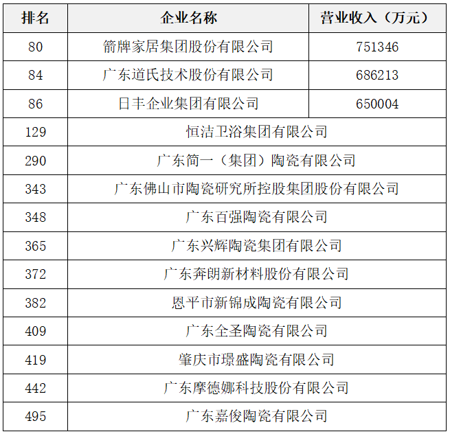 11月21日,广东省制造业协会发布2023年广东省制造业企业500强名单。其中,简一、箭牌、恒洁、兴辉、新锦成、全圣、嘉俊、百强、璟盛、摩德娜、金刚、奔朗、道氏等14家陶卫及相关企业上榜。