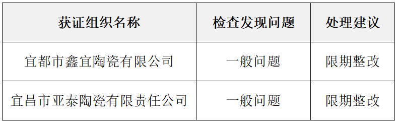 此外,在湖北省宜昌市市场监督管理局发布的2023年认证从业机构“双随机、一公开”监督检查情况的通告中,宜都市鑫宜陶瓷有限公司、宜昌市亚泰陶瓷有限责任公司等2家陶企认证被检查发现问题,被限期整改。